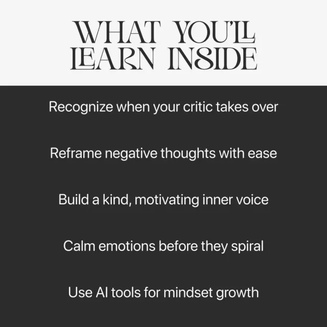 • Lasting clarity: Understand how to stop my inner critic so you can think and act with more confidence.