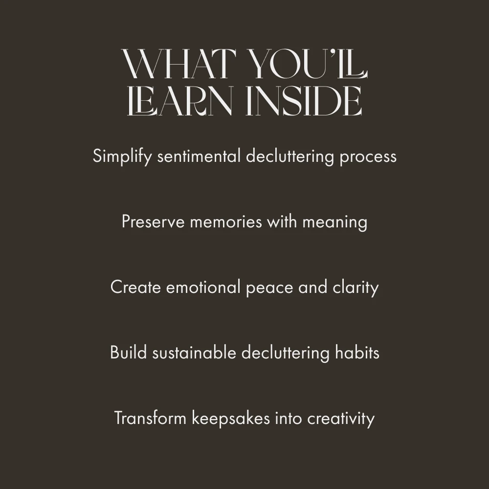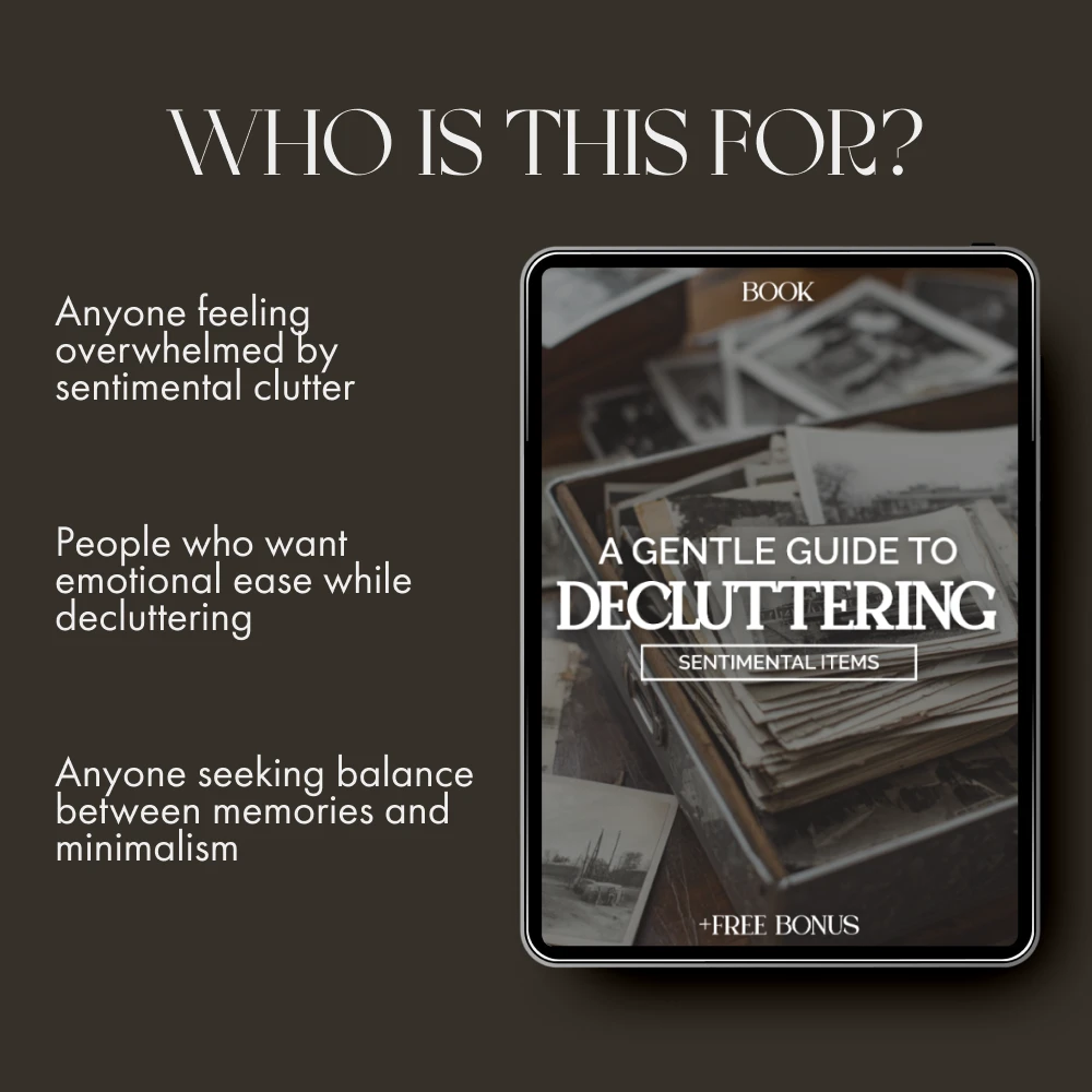Download your copy today and begin your journey toward mindful, meaningful minimalism. Reclaim peace, create space, and keep what truly counts—with A Gentle Guide to Decluttering Sentimental Items.