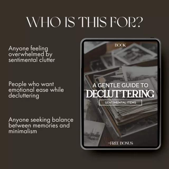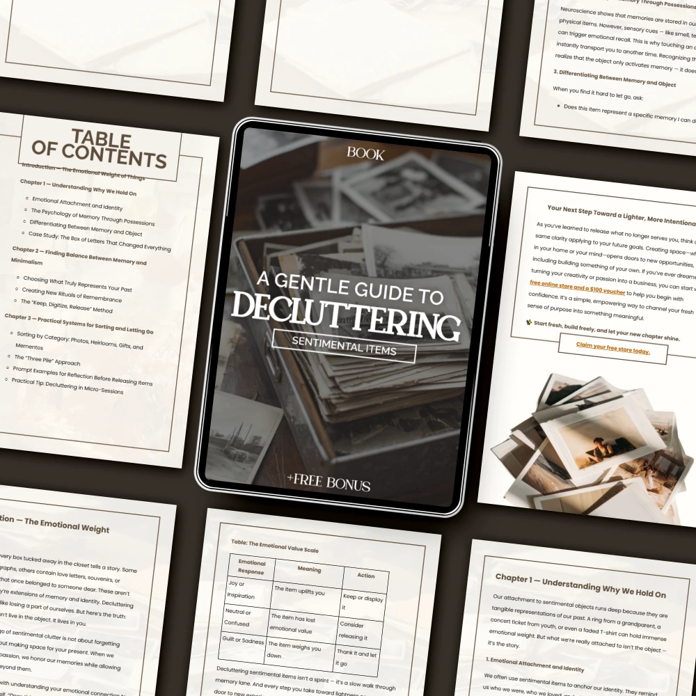“A Gentle Guide to Decluttering Sentimental Items” is more than an eBook—it’s a compassionate companion for anyone who struggles with emotional clutter. If you’ve ever opened a box of old photos, love letters, or keepsakes and felt torn between memory and minimalism, this beautifully written digital guide will help you navigate those emotions with grace and clarity. Learn exactly how to declutter sentimental items without guilt, overwhelm, or regret—while preserving the stories that matter most.