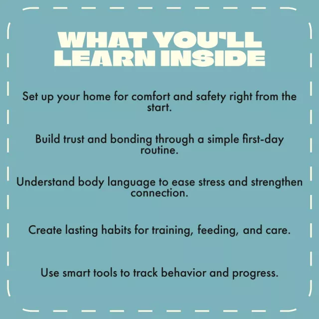 • Chapter 4: Setting Up for Success Beyond Day One – Build a consistent routine, plan for vet visits, and ensure long-term happiness.