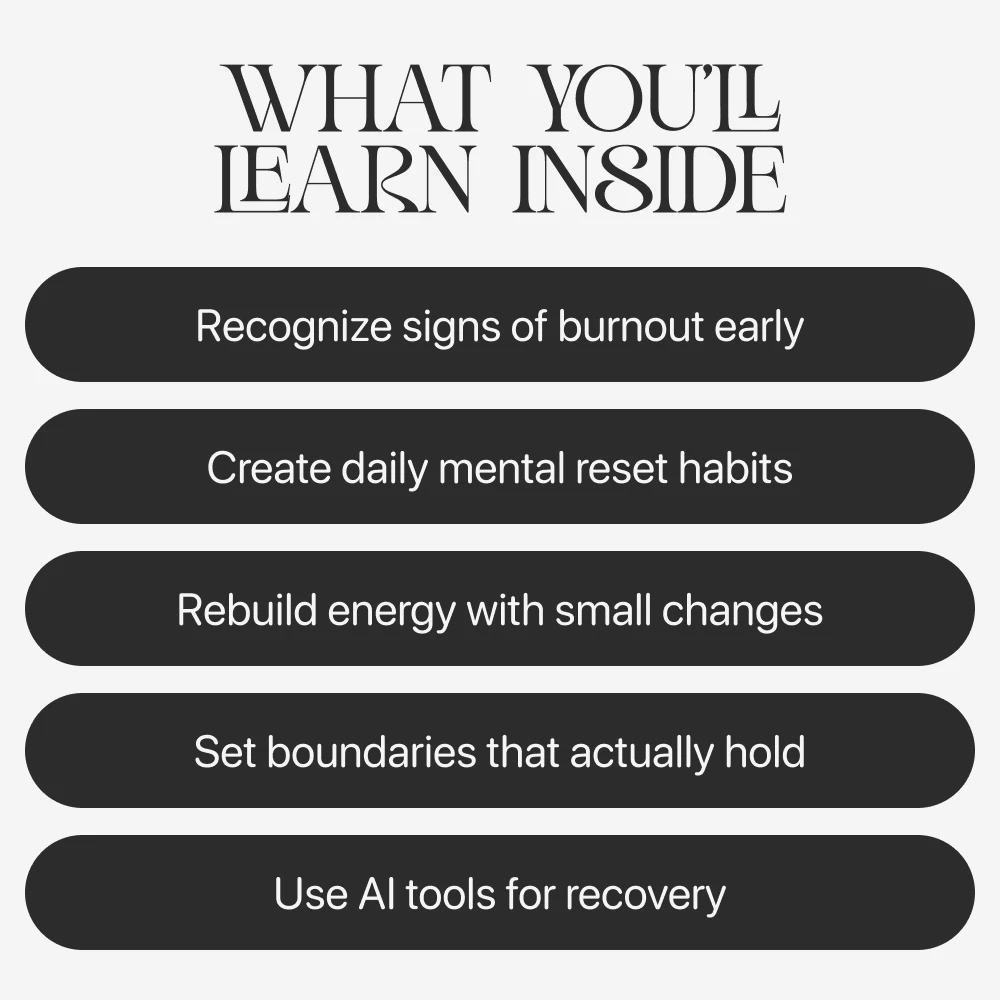 Unlike typical burnout guides, this eBook blends emotional insight with actionable tools, integrating modern AI support for guided reflection. It’s written in a warm, human tone—practical enough to help right now, yet meaningful enough to create lasting change.