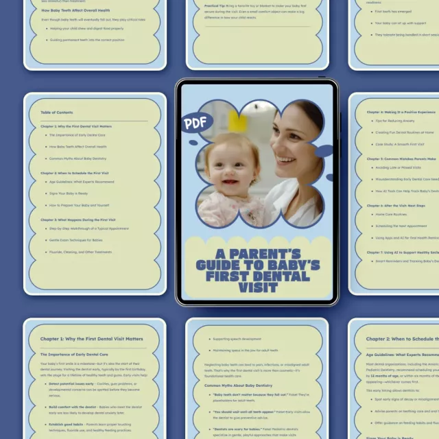 Your baby’s first dental appointment doesn’t have to be confusing or stressful. A Parent’s Guide to Baby’s First Dental Visit is a clear, reassuring, and practical ebook designed to help you feel fully prepared for one of your child’s earliest healthcare milestones. Whether you’re unsure when baby first visits dentist or wondering what actually happens during that first appointment, this guide walks you through everything step by step in a calm, parent-friendly way.