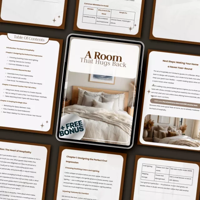 A Room That Hugs Back isn’t just about decorating—it’s about crafting experiences. You’ll learn how to blend comfort, beauty, and heart into every detail of your guest room. Download your copy today and start creating a space that doesn’t just look inviting—one that truly feels like a hug.
