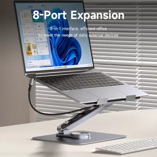 This stand isn’t just about lifting your laptop — it’s about upgrading your entire desk setup. The 360° rotating base makes sharing your screen effortless, while the adjustable height and angle help you maintain perfect posture and reduce neck and back strain. Plus, the integrated USB-C docking station brings ultimate connectivity right to your fingertips, including a 4K HDMI-compatible port for stunning video output.