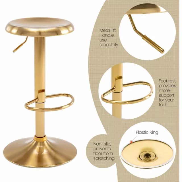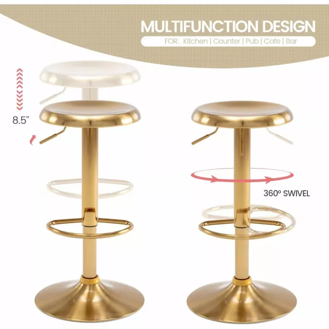Ideal for a wide range of settings, from kitchen counters to home bars, these stools can transform your space into a stylish, comfortable area for family, friends, or guests. Their versatility and attractive gold-brushed finish make them a stunning piece for both residential and commercial use. Plus, the 360-degree swivel feature ensures that everyone can join the conversation effortlessly, creating a dynamic, social atmosphere wherever they are placed.