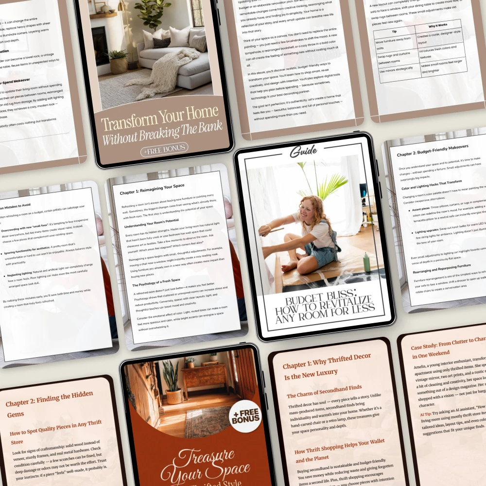 This collection gave me structure when I had zero idea where to start. I wanted a new look for my office but could not justify spending much. The budget guide explains how to evaluate what you already own before buying anything, which saved me from unnecessary purchases. I reorganized shelves, repainted a small accent piece, and followed the simple styling formulas included. The thrift focused tips helped me spot quality items instead of random clutter. I found a second hand chair and refreshed it with a cushion as suggested. The transformation happened gradually over two weeks, and it never felt stressful. The advice is clear and written in a way that feels supportive rather than complicated. Having everything in a digital format meant I could reference it anytime. My office now feels calm, intentional, and far more expensive than it actually was.