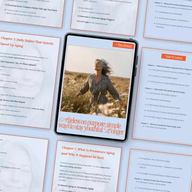 Ageless on Purpose: Simple Ways to Stay Youthful Longer is a practical, science-informed digital guide designed to help you slow premature aging without extreme routines, expensive treatments, or confusing advice. This easy-to-follow eBook blends skincare foundations, lifestyle shifts, and modern AI insights to help you protect your skin, energy, and confidence for the long term. Instead of reacting to aging after it shows up, you’ll learn how to prevent it—intentionally, consistently, and realistically.