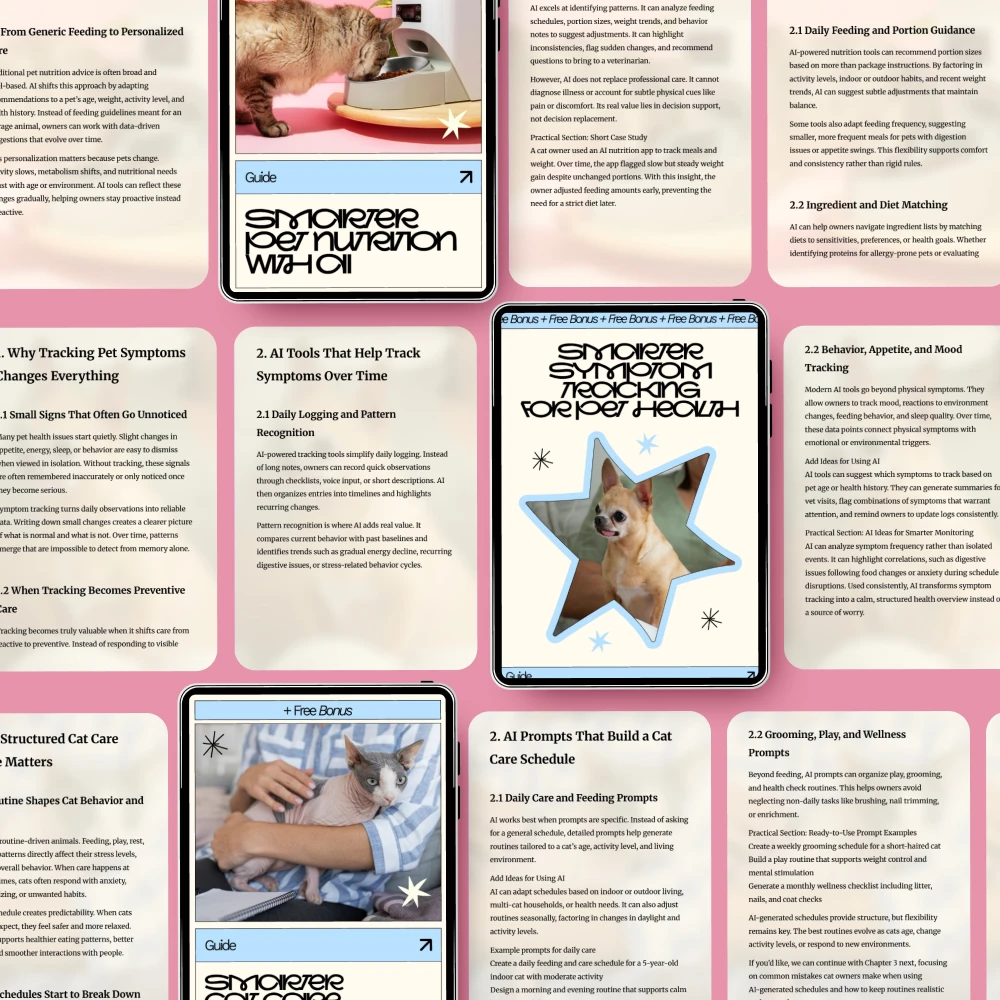 Don’t miss out on the chance to enhance your pet care routine with the power of AI. Download the AI-Based Pet Behavior Toolkit for Every Pet Parent now and start transforming your pet’s behavior and health today. With guides, checklists, and eBooks packed with actionable insights, this toolkit will become your go-to resource for smarter pet care!