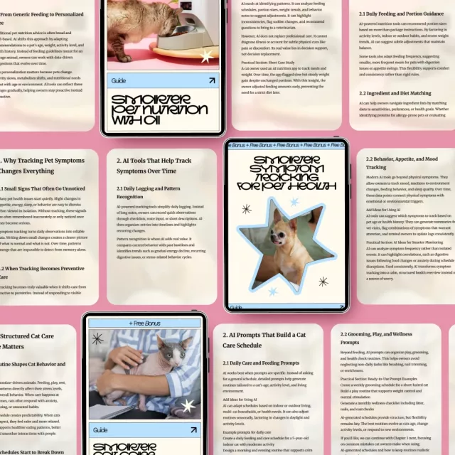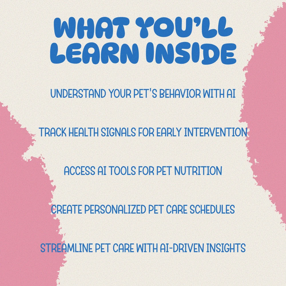 Unlike other pet care resources, this toolkit focuses on utilizing AI to provide personalized insights for your pet’s health and behavior. With practical, real-world applications like AI-powered symptom tracking and behavior decoding, you can take your pet care to the next level. Plus, you won’t have to search for individual guides or apps—everything you need is right at your fingertips, all in one convenient download.