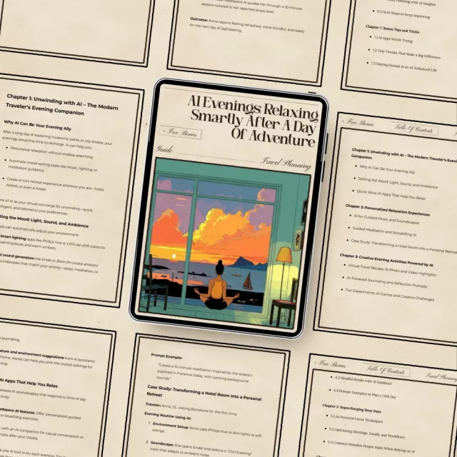 After a day filled with adventure, there’s nothing better than winding down in a way that refreshes your mind and body. AI Evenings: Relaxing Smartly After a Day of Adventure is a thoughtfully designed digital download that helps you make the most of your evenings, combining technology, mindfulness, and creativity. Whether you’re on the road, staying in a hotel, or enjoying a quiet night at home, this guide, eBook, and checklist shows you how to transform ordinary evenings into personalized, rejuvenating experiences using AI.