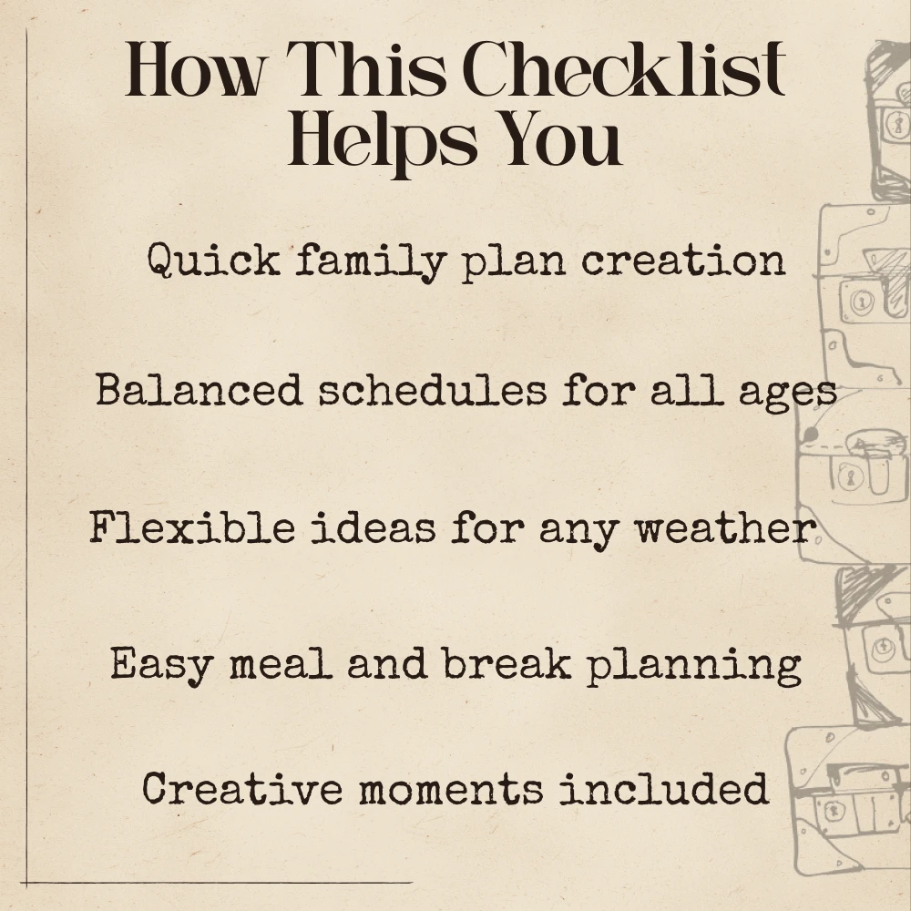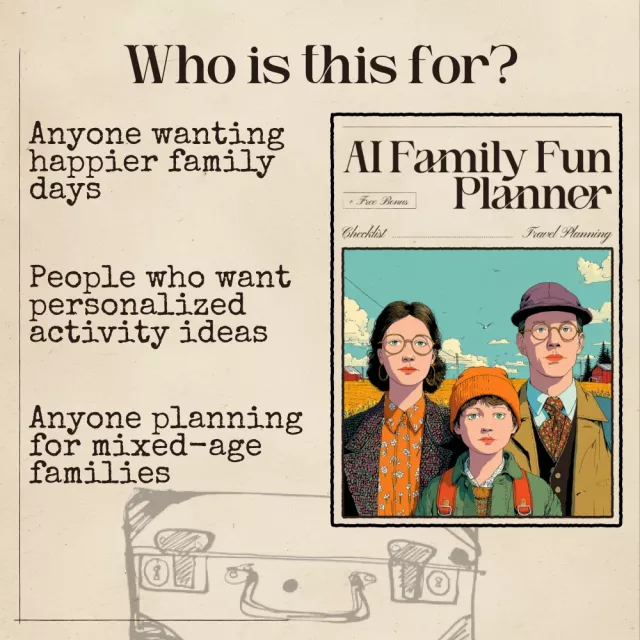 Unlike traditional planning templates, the AI Family Fun Planner teaches you exactly what to ask AI so it can build the perfect schedule for your unique family. You’re not stuck with pre-filled ideas—every plan becomes fully tailored to your group’s ages, energy levels, interests, accessibility needs, and timeframes. This guide gives you clarity, creativity, and total flexibility.