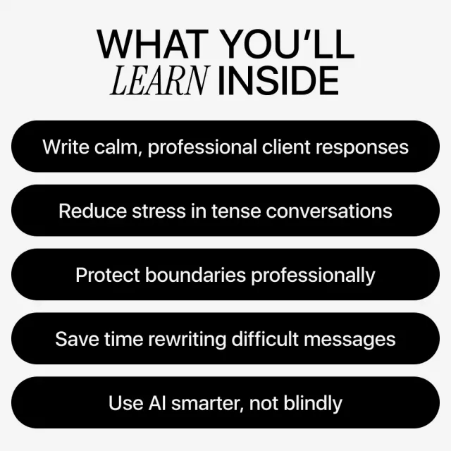 This ebook is ideal for freelancers, virtual assistants, consultants, coaches, small business owners, and service providers who regularly communicate with clients and want to handle conflict without anxiety or burnout.