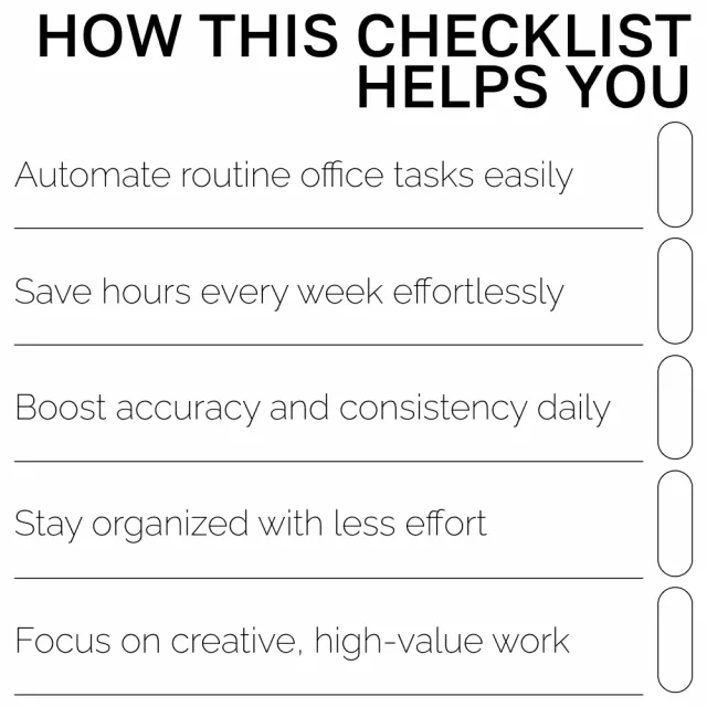 Unlike generic productivity guides, this checklist gives you clear, ready-to-use AI prompts and real examples for automating real-world office tasks. It bridges strategy with action—helping you go from overwhelmed to efficient, one automation at a time.