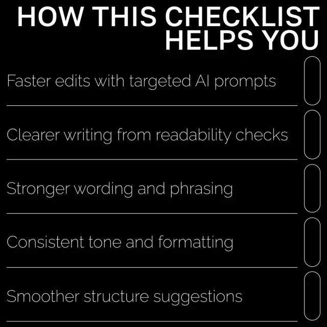 Download your checklist now and start editing smarter, faster, and with more confidence. Take the guesswork out of AI-assisted editing and make your writing shine.