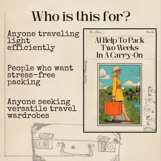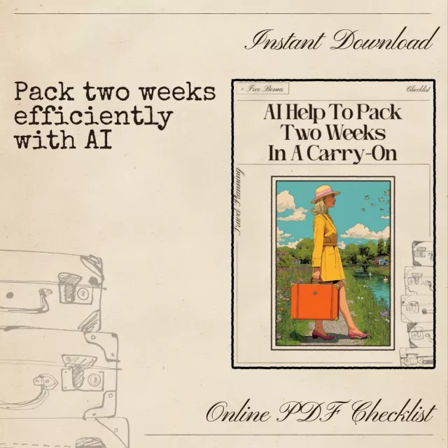 Stop guessing what to pack and start traveling smarter. Download your AI Help to Pack Two Weeks in a Carry-On checklist now and enjoy stress-free, organized, and stylish travel for your next adventure!