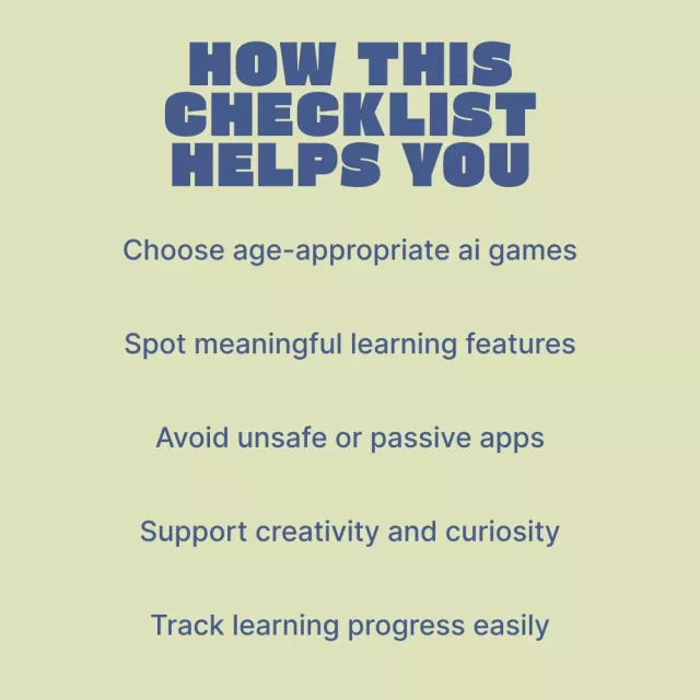 Unlike generic game lists or app recommendations, this checklist teaches you how to think about AI learning games for kids. It empowers you to evaluate any current or future game—no matter how fast technology changes—so you’re never dependent on trends or ads.