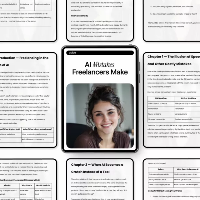 Unlike generic AI tutorials or prompt collections, AI Mistakes Freelancers Make focuses on strategy, positioning, and decision-making. It doesn’t just tell you how to use AI — it shows you when not to, and why that distinction matters.