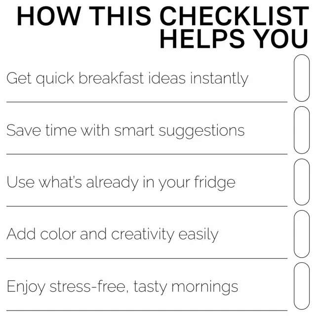 Say goodbye to morning food indecision with AI-Powered Breakfast Brainstorm: Your Fun & Easy Checklist — a playful, digital guide designed to make breakfast fun, creative, and stress-free. Whether you’re short on time or ingredients, this checklist uses ai help with breakfast ideas to turn what’s already in your kitchen into delicious, colorful meals. From quick five-minute bites to cozy weekend creations, this printable checklist helps you spark inspiration, save time, and fall in love with your mornings again — all with a little AI magic.