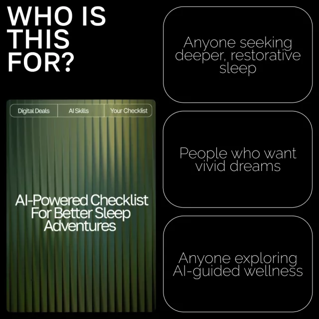 This digital checklist is perfect for dreamers, sleep enthusiasts, busy professionals, creatives, wellness seekers, or anyone curious about combining practical sleep habits with AI-powered guidance. No experience required—just an open mind and a desire for better nights.