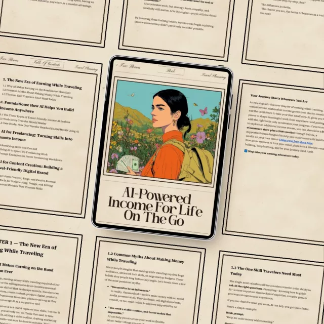 If you’ve ever dreamed of earning money from anywhere in the world, AI-Powered Income for Life on the Go is your roadmap to making it real. This beginner-friendly eBook shows you step-by-step how to use AI tools to generate income whether you’re backpacking across continents, enjoying slow travel, or planning your first digital-nomad escape. Packed with real-world examples and simple strategies, this guide reveals how ai for earning money while traveling is more achievable today than ever before.