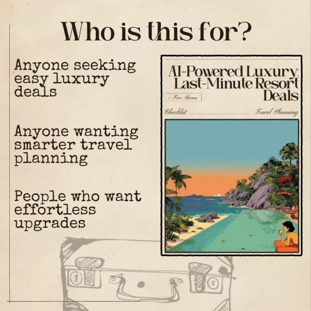Unlike generic travel tips, this resource focuses exclusively on AI-driven strategies. It teaches you how to pair flexibility with smart tech, how to spot opportunities for upgrades, and how to automate your search for high-end resort deals—all in a concise, actionable format.