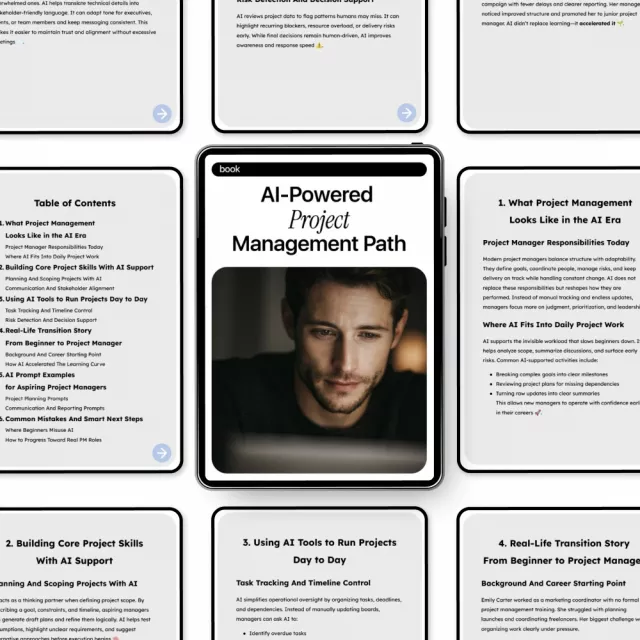 This ebook is built for action. Instead of generic advice, it shows you how to use ai to become a project manager through clear explanations, practical examples, and ready-to-use prompts. You’ll learn how AI can support planning, decision-making, and communication—without replacing the human skills employers actually care about.