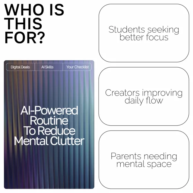 Unlike typical productivity guides, AI-Powered Routine to Reduce Mental Clutter blends structure with flexibility. You’ll learn how to use ai routine to reduce mental clutter to offload mental noise, set healthy boundaries with technology, and automate repetitive planning—so your brain stays focused on what truly matters.