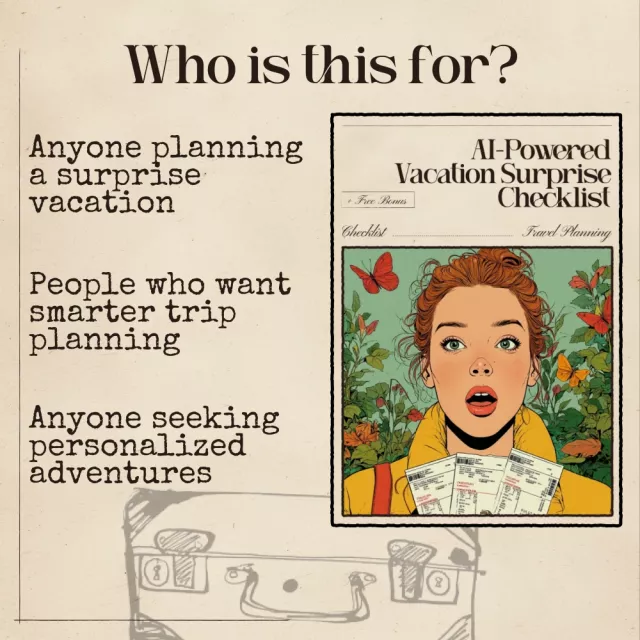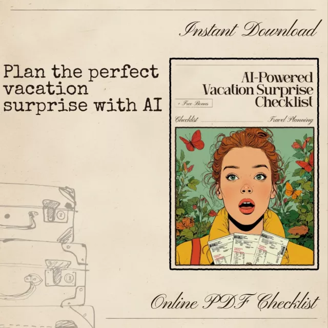 Don’t wait! Download the AI-Powered Vacation Surprise Checklist today and start planning a vacation that will be remembered for years to come. With AI at your side, you can craft the perfect surprise trip that’s perfectly tailored to your loved one’s tastes—without them ever guessing what’s in store!
