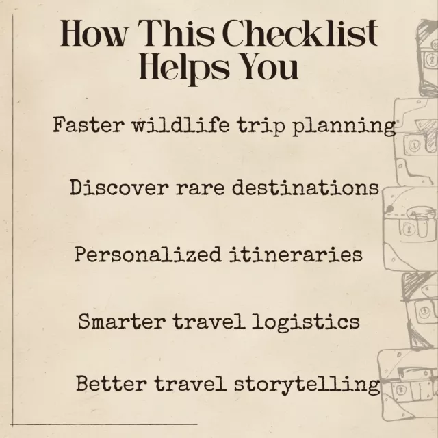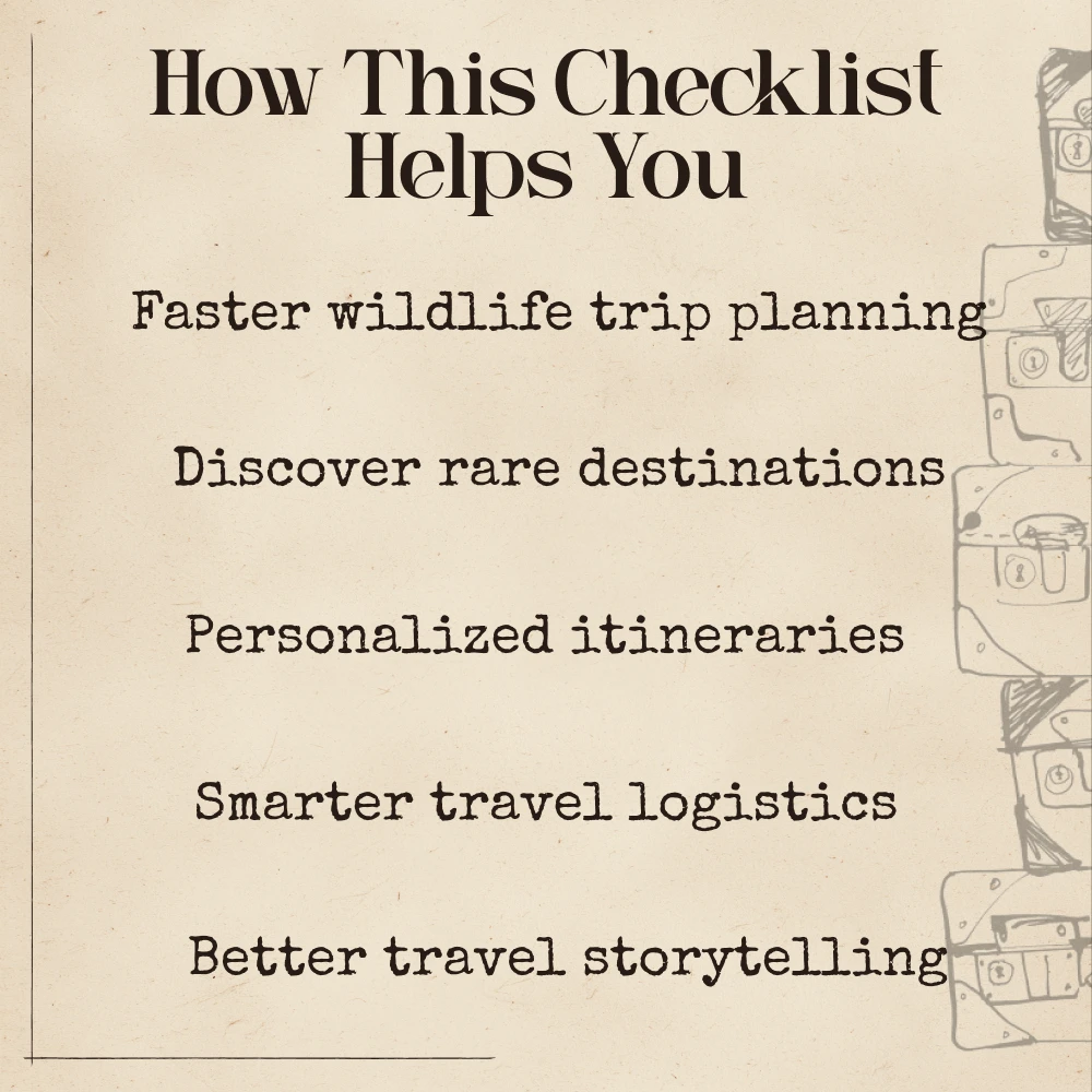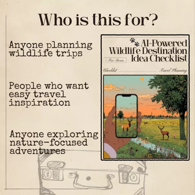 This digital checklist is perfect for wildlife travelers, nature photographers, adventure planners, eco-travelers, bloggers, and creators who want structured guidance and AI-powered inspiration. Whether you’re planning your first wildlife trip or creating content around global wildlife destinations, this resource elevates your creativity and efficiency.
