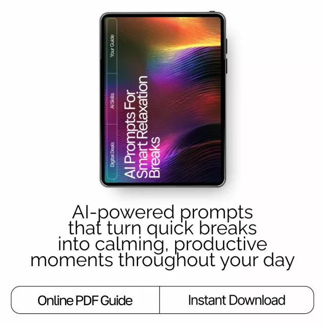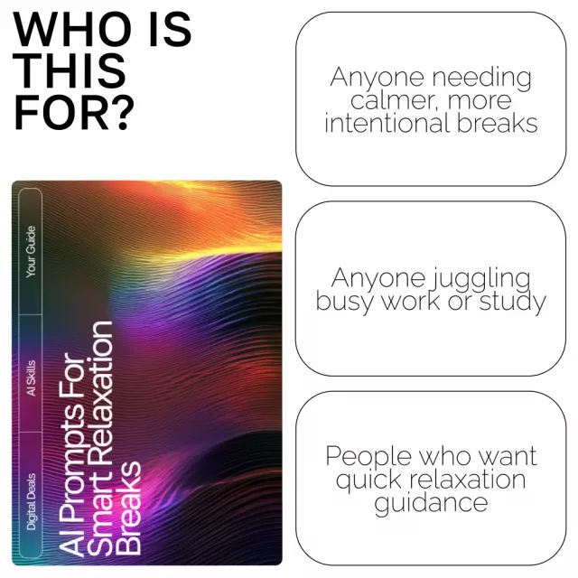 This digital guide stands apart by blending modern AI support with proven relaxation techniques. Instead of generic advice, it gives you curated, structured ai prompts for relaxation breaks designed to fit into real workloads and real lifestyles. It’s practical, actionable, and intentionally simple so you can start using it right away.