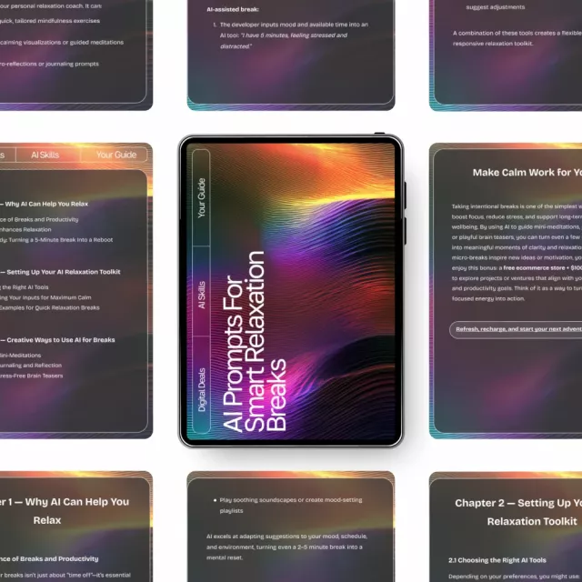 • Chapter 3 — Creative Ways to Use AI for Breaks: Guided mini-meditations, micro-journaling prompts, and fun stress-free brain teasers.