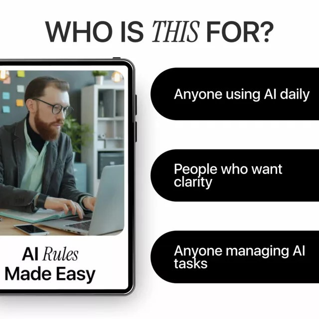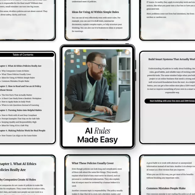 Step into the world of AI with confidence! AI Rules Made Easy is a practical digital guide designed to demystify AI ethics and help you understand complex policies quickly. Whether you’re a professional navigating AI tools at work, a team leader ensuring compliance, or just someone curious about AI, this guide breaks down AI ethics policies explained simply, so you can focus on applying them effectively instead of getting lost in jargon.