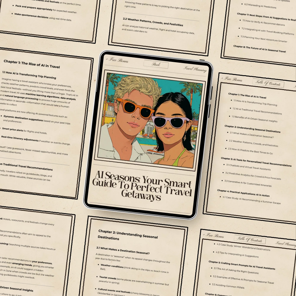 Discover your perfect getaway every time of year with AI Seasons: Your Smart Guide to Perfect Travel Getaways — the ultimate digital travel resource for modern explorers who want smarter, faster, and more personalized trip planning. Whether you’re dreaming of a peaceful winter escape, a vibrant summer adventure, or anything in between, this guide helps you unlock the power of AI to plan trips with confidence and clarity. Crafted for travelers, creators, and planners who want better insights and stress-free decision-making, this downloadable eBook turns technology into your smartest travel ally.