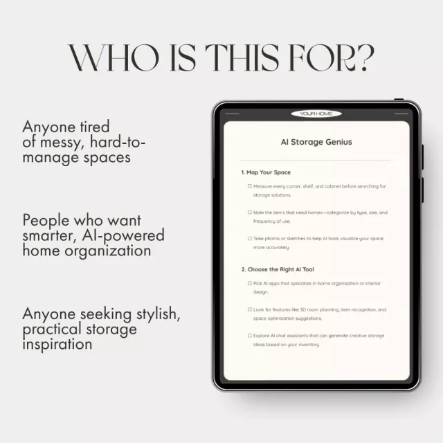Unlike generic organizing guides, AI Storage Genius merges real-world design principles with cutting-edge technology. You’ll not only declutter — you’ll learn how to use AI to suggest storage solutions that fit your unique needs, preferences, and lifestyle.