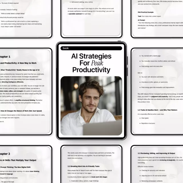 AI Strategies for Peak Productivity is a practical, no-fluff ebook designed to help you actually get more done with AI—without overwhelm or hype. Instead of focusing on tools alone, this guide teaches you how to think, plan, and work differently using AI as a productivity partner. If you’ve experimented with AI but feel like you’re not getting consistent results, this ebook shows you how to turn AI into a repeatable system that supports real work, real deadlines, and real goals.
