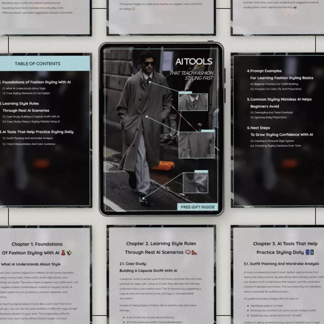 This ebook is built for people who want to learn by doing. Instead of theory-heavy explanations, you’ll see how ai tools to learn fashion styling basics can be used in real scenarios—planning outfits, correcting errors, and practicing daily decisions. You are not just reading about style; you are actively learning how to think like a stylist with AI as your guide.