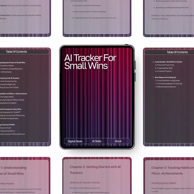 Unlock the momentum you’ve been missing with the AI Tracker for Small Wins, a powerful digital eBook designed to help you build habits, measure micro-achievements, and celebrate progress in a way that finally feels doable. Whether you’re chasing big goals or simply want more structure in your day, this guide shows you how focusing on small, consistent actions can create meaningful long-term change. With easy-to-follow explanations, real examples, and AI-enhanced tools, this resource empowers you to stay motivated and make progress you can actually see.