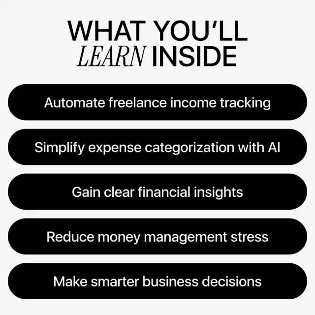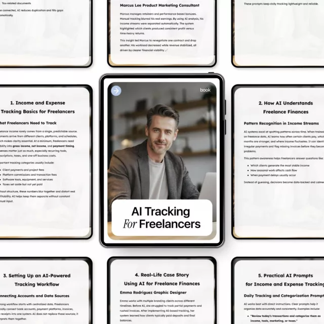 This ebook goes beyond theory and focuses on real-world use of ai for tracking freelance income and expenses. You won’t find generic advice or complicated accounting language. Instead, you’ll get actionable workflows, ready-to-use prompts, and relatable examples that show exactly how freelancers are using AI to save time, avoid money mistakes, and feel more confident about their finances.