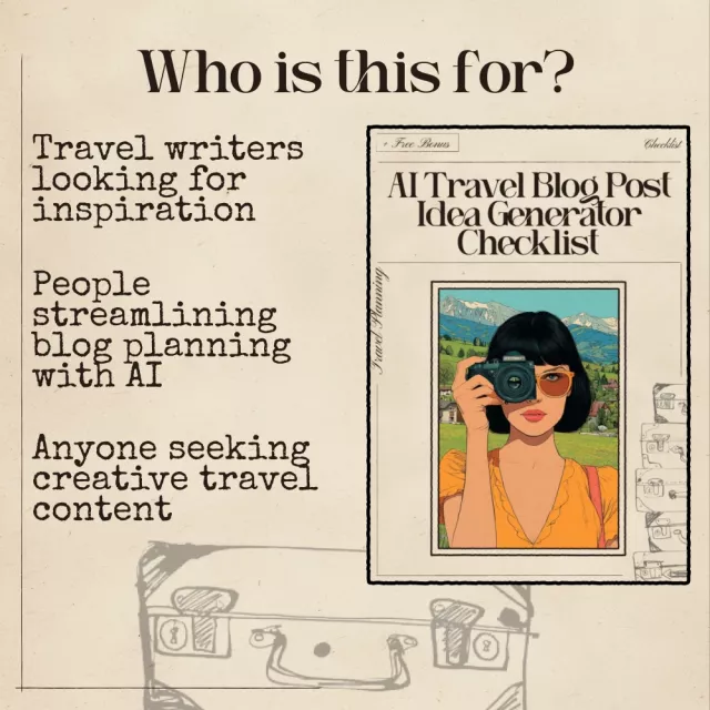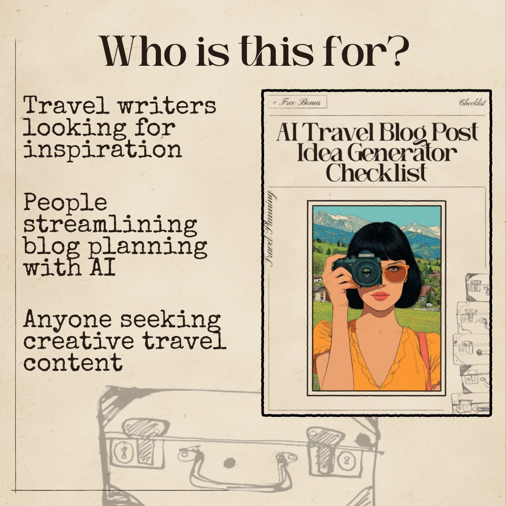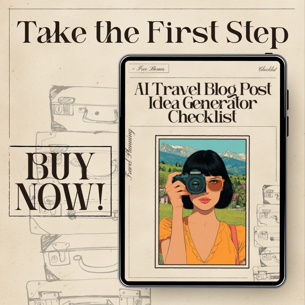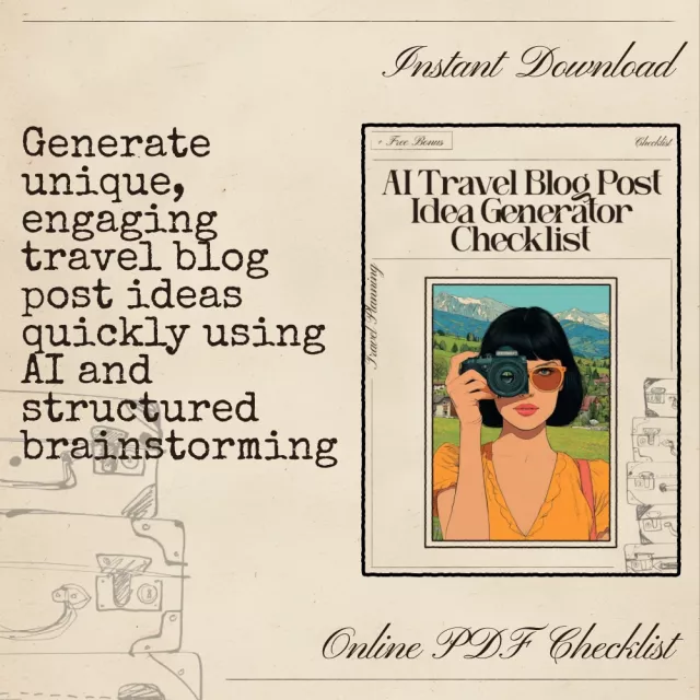 Transform your travel blog with endless creative ideas. Download the AI Travel Blog Post Idea Generator Checklist now and start generating unique, scroll-stopping posts that keep your audience engaged and coming back for more!