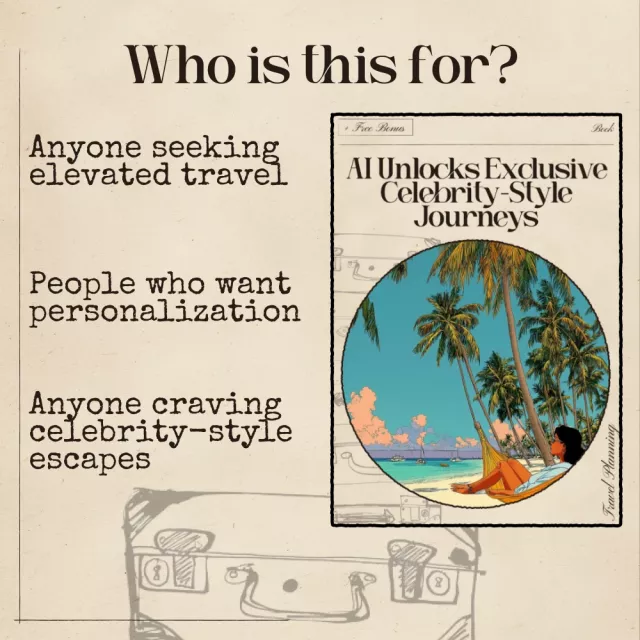 This eBook is perfect for travelers who crave luxury experiences, busy professionals seeking simplified planning, creators exploring new destinations, and anyone who wants to elevate their trips using AI. No tech expertise required—just curiosity and a desire for unforgettable journeys.
