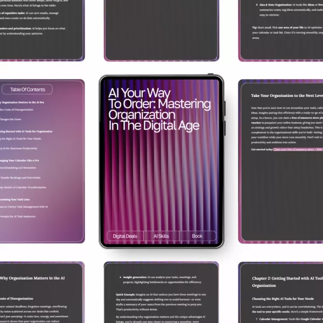 If you’ve ever felt overwhelmed by endless tasks, scattered notes, and a calendar that never seems to stay under control, this eBook is your new secret weapon. AI Your Way to Order: Mastering Organization in the Digital Age is a practical, easy-to-follow digital guide designed to help you finally take control of your time, routines, and mental space—using the power of artificial intelligence. Whether you’re a business owner, student, or busy parent, this resource shows you exactly how to use ai to stay organized with clarity and confidence.