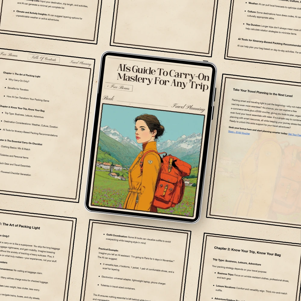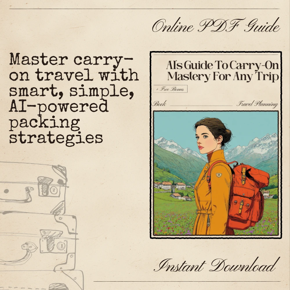 Say goodbye to overstuffed luggage and stressful last-minute packing. AI’s Guide to Carry-On Mastery for Any Trip is your all-in-one digital roadmap to traveling lighter, smarter, and more confidently than ever. Designed for modern travelers, this eBook blends practical packing wisdom with the power of AI to transform the way you prepare for any journey. Whether you’re heading out for a weekend city escape or a two-week overseas adventure, this guide helps you master every inch of your carry-on—no guesswork required. Perfect for anyone seeking the ultimate ai carry on only packing guide for any trip.