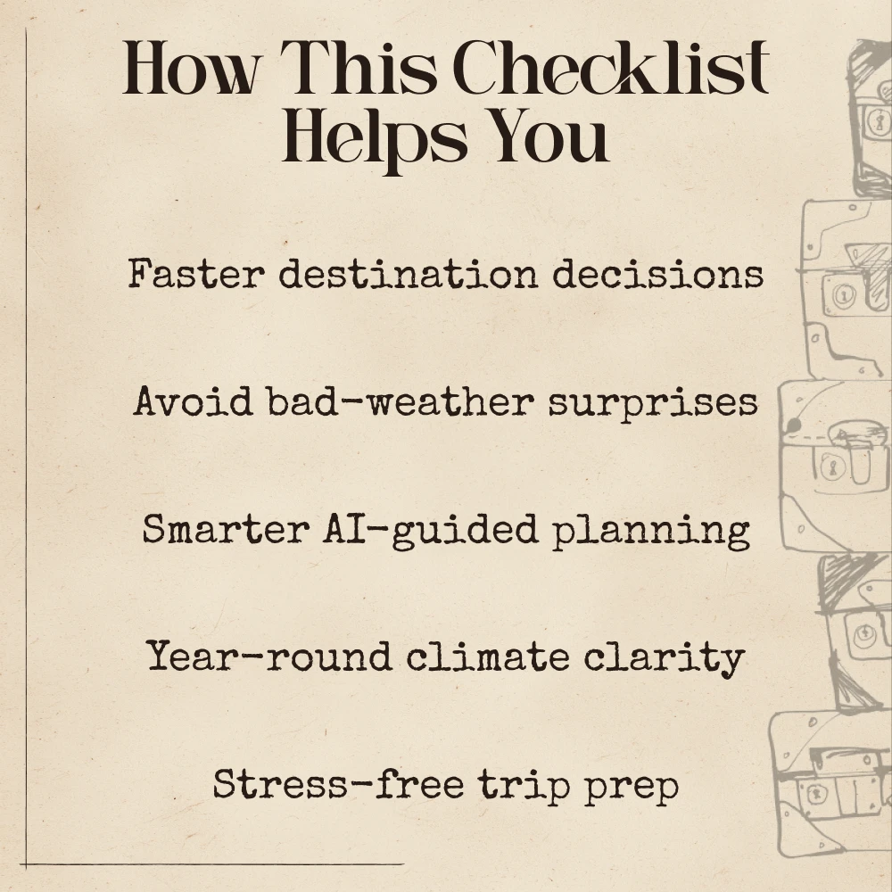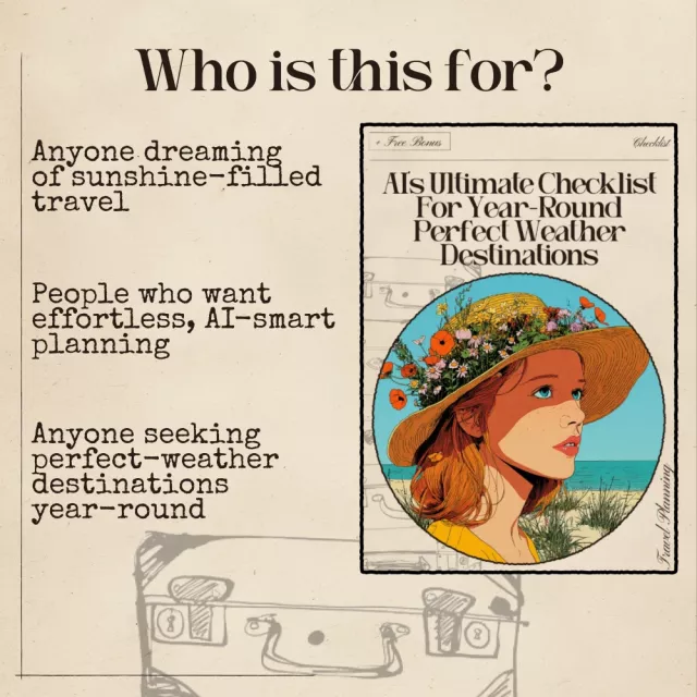 Unlike generic travel guides, this checklist teaches you *how* to think like AI, giving you a repeatable system to uncover sunshine-friendly destinations any time of year. It blends practical travel planning with simple technology guidance, making it the ideal tool for travelers who want smarter, faster, and more enjoyable trip planning.