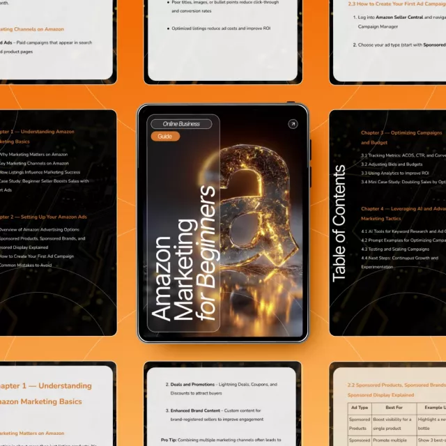 • Chapter 1 — Understanding Amazon Marketing Basics: Learn why marketing matters, how listings drive success, and explore a real case study from a beginner seller who boosted sales with smart ads.