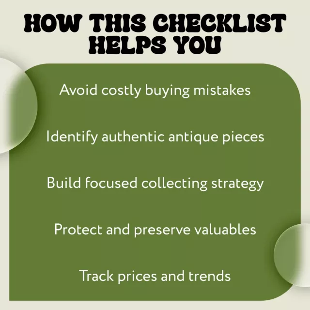 Unlike generic guides, this checklist blends traditional antique knowledge with modern tools like AI-powered research and trend tracking. It’s concise, actionable, and designed to be reused every time you shop, research, or review your collection.