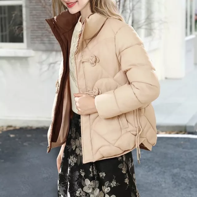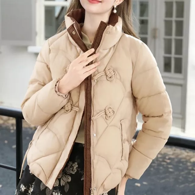This winter coat is made from durable polyester with a polyester fiber filling to keep heat in while staying lightweight. It has a full zipper closure for easy wear, a high turtleneck for added protection against cold wind, and a regular length that falls comfortably around the hips. The loose wide-waist cut allows you to layer sweaters or hoodies underneath without feeling bulky. Functional pockets and button accents add both style and practicality.