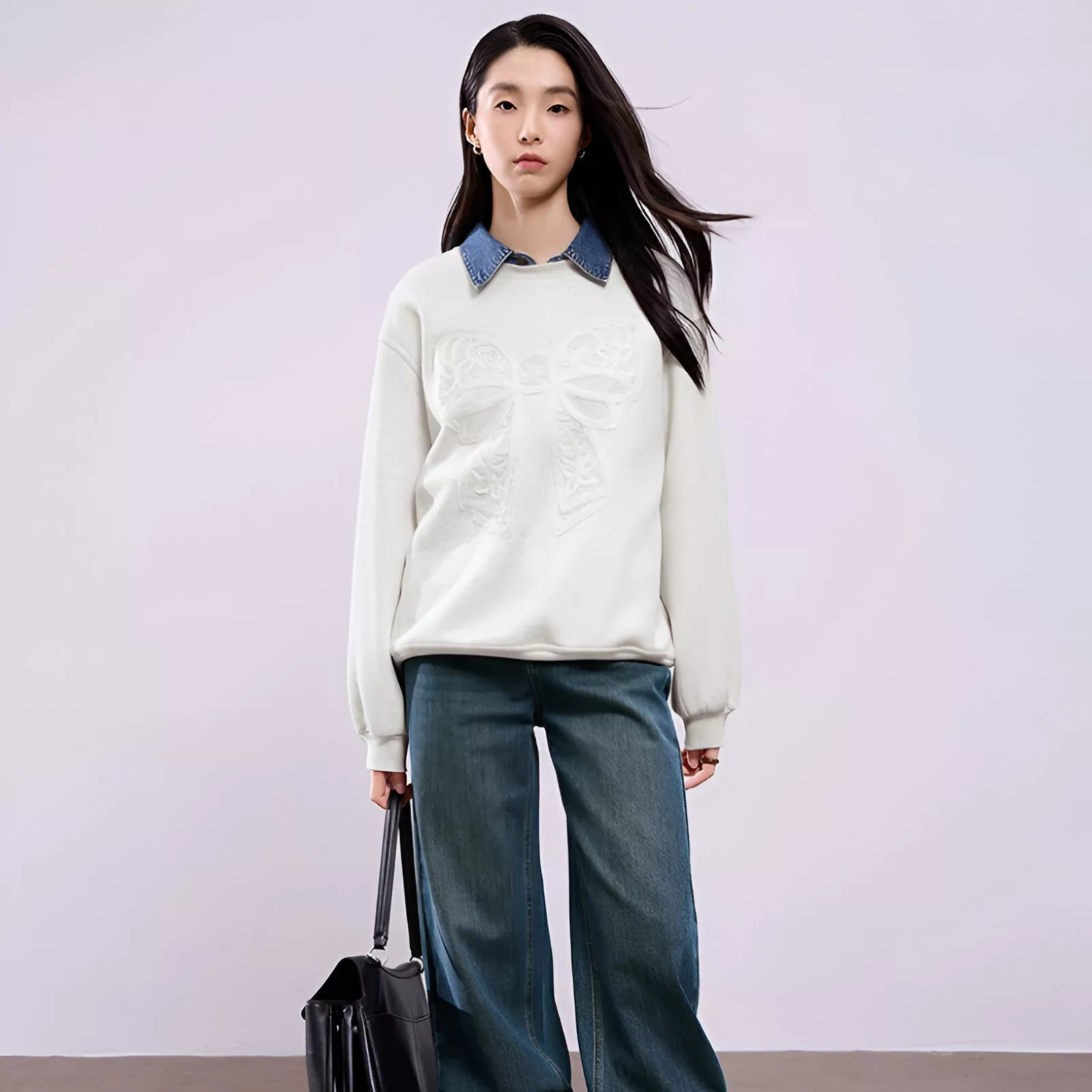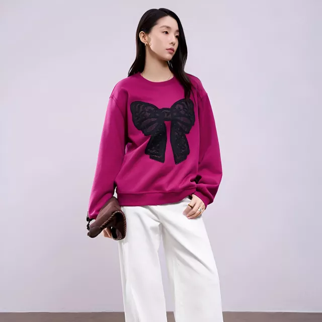 Unlike ordinary sweatshirts, this hoodie stands out with its graceful bow accent and lace detailing that elevate your everyday wardrobe. The fabric blend of cotton and polyester gives you the perfect balance of softness and durability, while the medium-weight knit keeps you warm without overheating. The crew neck design adds comfort and makes layering easy during colder months.