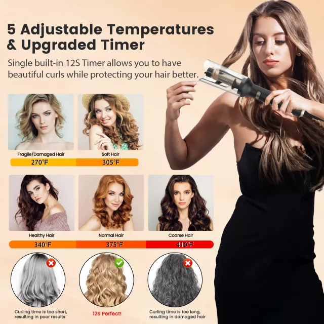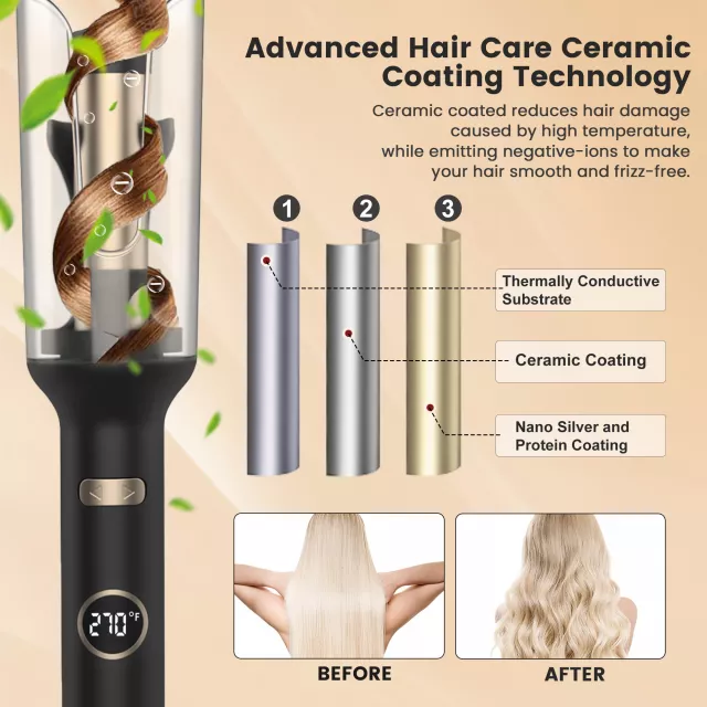 Designed with advanced tourmaline ceramic technology, this curler distributes heat evenly while reducing frizz and static. The digital temperature control lets you select the ideal heat setting, from 248°F to 410°F, making it suitable for all hair types—fine, medium, or thick. The automatic rotation feature ensures each strand is curled to perfection without tangles or uneven results.