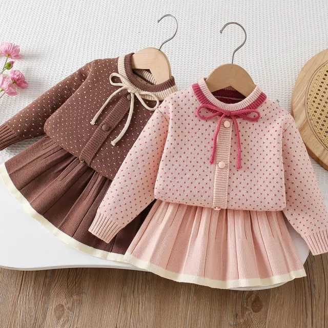 Dress your little one in this delightful two-piece sweater and skirt set, designed to bring warmth and style to every fall day. The classic polka dot knit sweater, accented with a sweet bow, pairs perfectly with a playful color-blocked pleated skirt. This set is a perfect choice for everyday outings, family photoshoots, or special fall occasions where comfort and cuteness matter most.