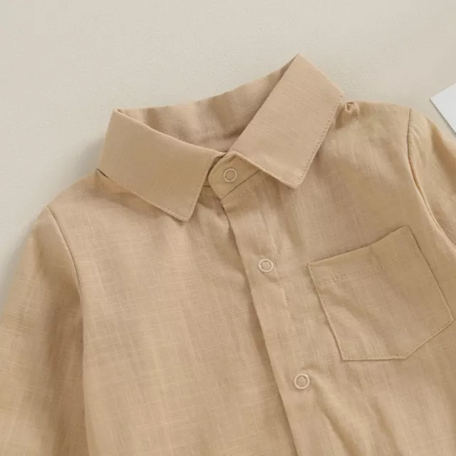 This adorable baby boy cotton linen romper is designed to make your little one look charming while keeping him comfortable all day long. Made from a breathable blend of 60% cotton and 40% polyester, it’s soft on delicate skin yet durable enough for everyday wear. The solid color design, turn-down collar, and single-breasted button closure create a timeless, classic look perfect for any occasion—from family gatherings to casual playdates.